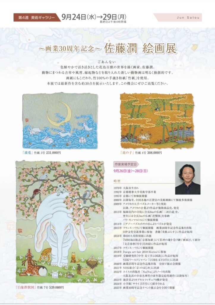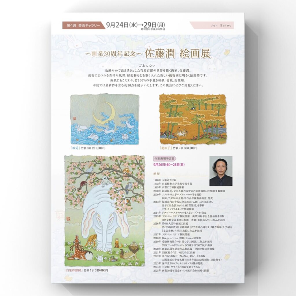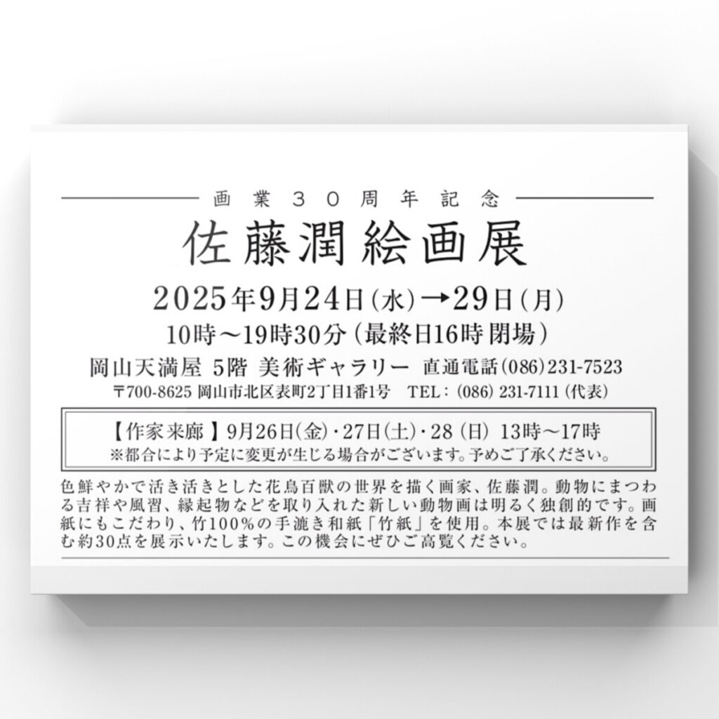 色鮮やかで活き活きとした花鳥百獣の世界を描く画家、佐藤潤。動物にまつわる吉祥や風習、縁起物などを取り入れた新しい動物画は明るく独創的です。画紙にもこだわり、竹100%の手漉き和紙「竹紙」を使用。本展では最新作を含む約30点を展示いたします。この機会にぜひご高覧ください。